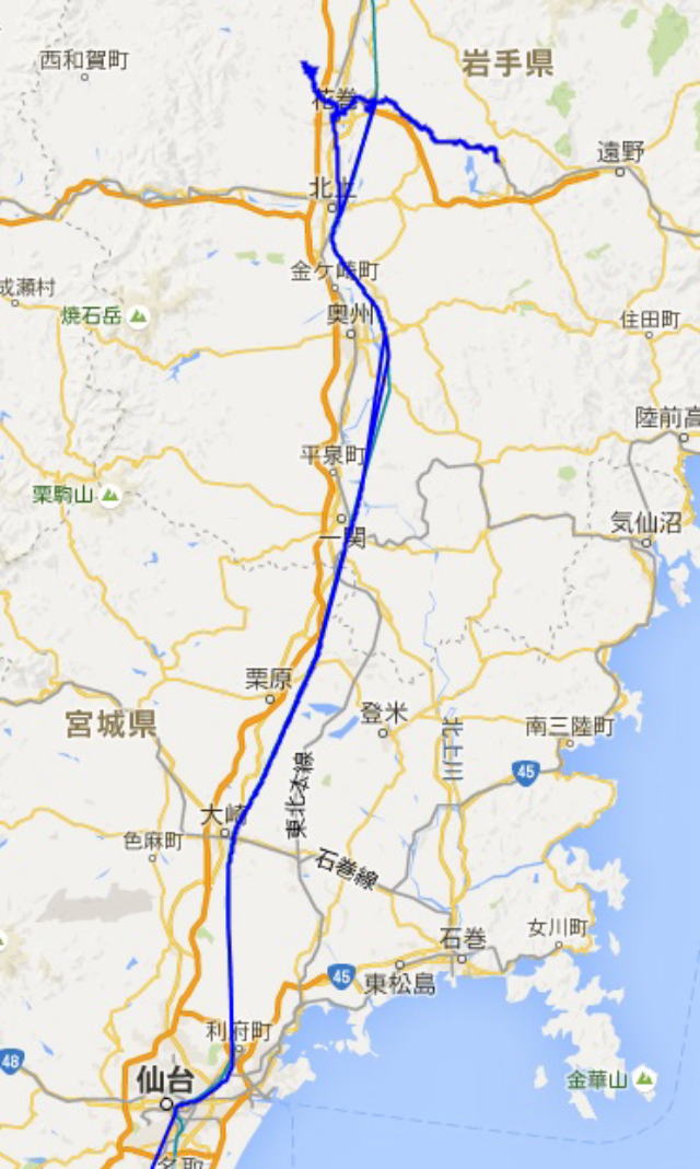 青色が実際に移動した軌跡。ただし、仙台-自宅間は省略)
