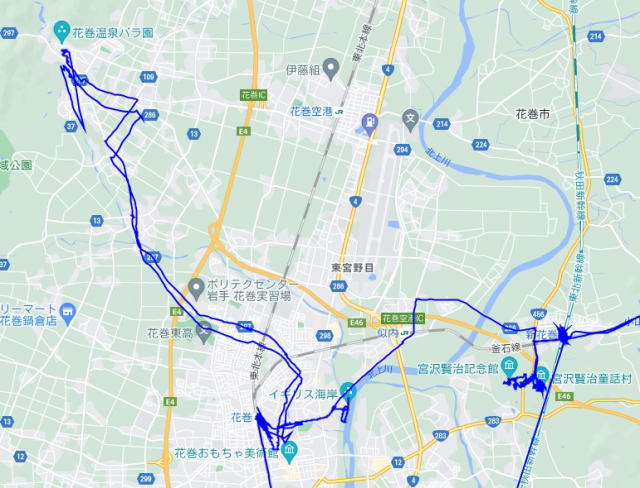 (花巻市の散策。 GPSロガーのログデータで実際に移動した場所の軌跡を表示)