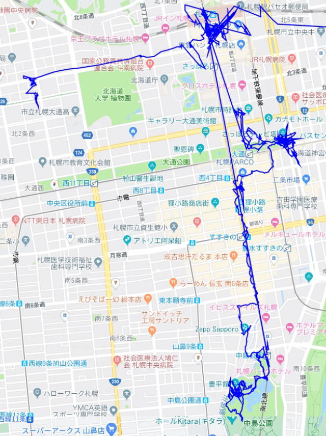 青色が実際に移動した軌跡。 ただし、札幌-東京間は省略)