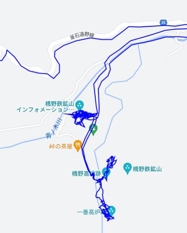 (橋野鉄鉱山周辺散策。 GPSロガーのログデータで実際に移動した場所の軌跡を表示)
