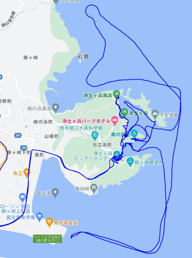 (浄土ヶ浜周辺散策。 GPSロガーのログデータで実際に移動した場所の軌跡を表示)