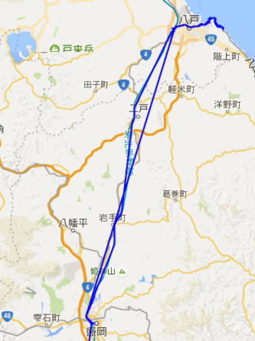 青色が実際に移動した軌跡。 ただし、盛岡→東京間は省略。)