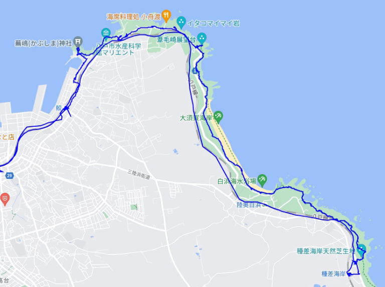 (種差海岸散策。 GPSロガーのログデータから実際に移動した場所の軌跡を表示。)