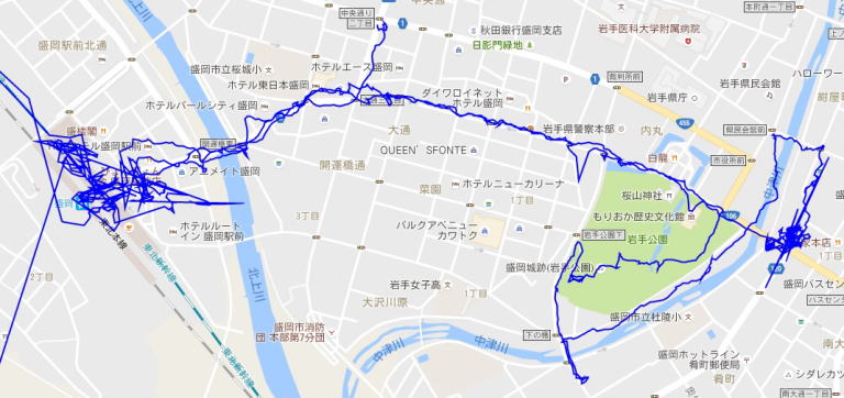(盛岡市内散策。 GPSロガーのログデータから実際に移動した場所の軌跡を表示。)