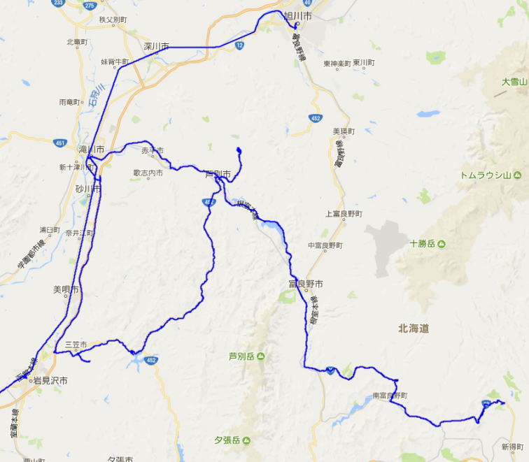 青色が実際に移動した軌跡。 ただし、札幌-旭川の往復は省略)