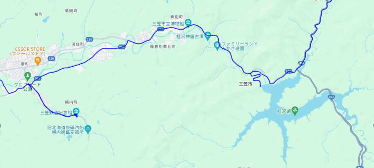 (桂沢ダム・三笠鉄道村周辺の散策。 GPSロガーのログデータで実際に移動した場所の軌跡を表示)