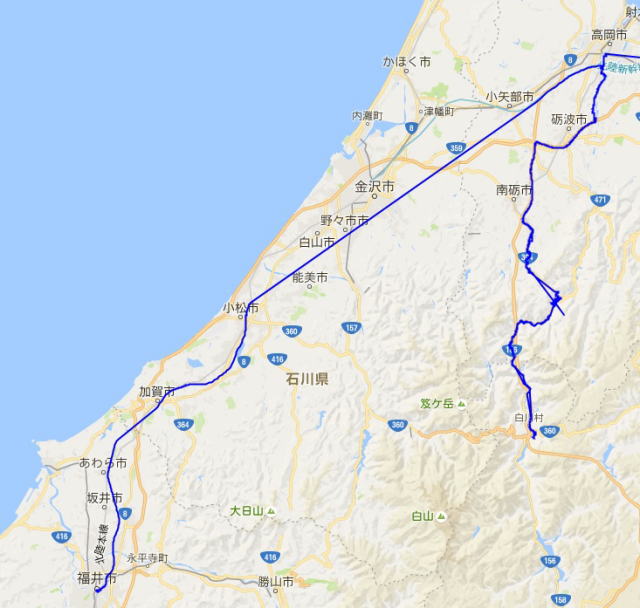 青色が実際に移動した軌跡。 ただし、自宅-高岡間は省略。)