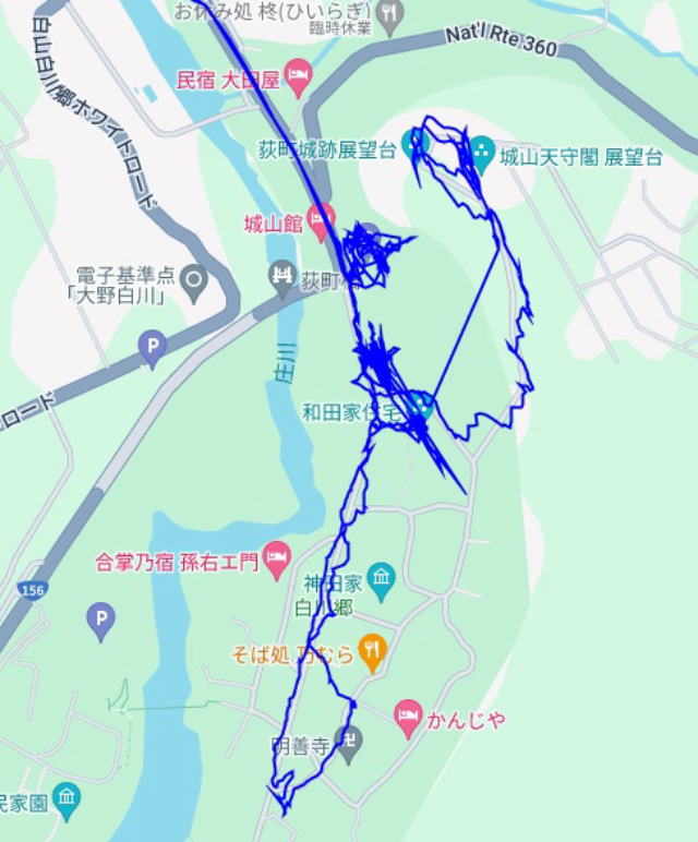 (相倉合掌集落散策。 GPSロガーのログデータで実際に移動した場所の軌跡を表示)