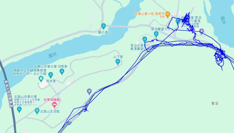 (菅沼合掌造集落散策。 GPSロガーのログデータで実際に移動した場所の軌跡を表示)
