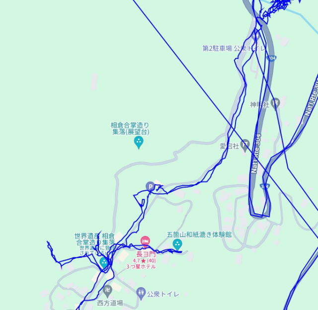 (白川郷散策。 GPSロガーのログデータで実際に移動した場所の軌跡を表示)