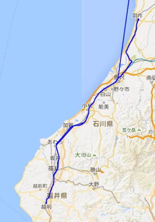 青色が実際に移動した軌跡。 ただし、金沢→東京間は省略。)