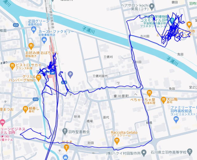 (羽咋市内散策。 GPSロガーのログデータから実際に移動した場所の軌跡を表示。)