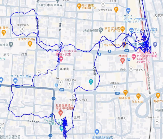 (武生駅周辺の散策。 GPSロガーのログデータから実際に移動した場所の軌跡を表示。)