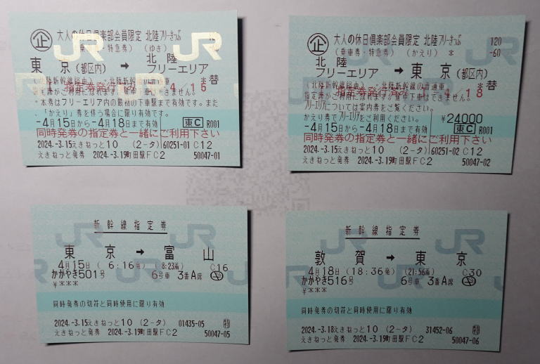 行きと帰りの新幹線は座席指定であるが、北陸エリア内のフリー区間は自由席利用となるため