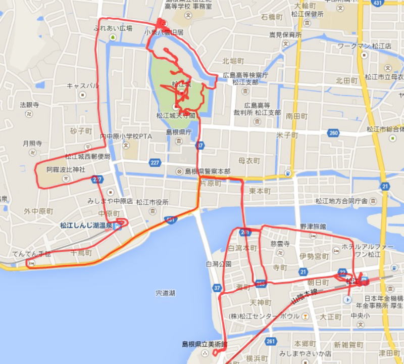 (松江散策。 GPSロガーを使って、ログデータから実際に移動した場所を表示。 赤色が実際に移動した軌跡。)