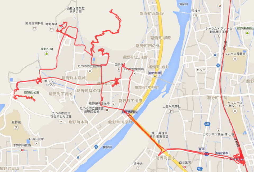(龍野散策。 GPSロガーを使って、ログデータから実際に移動した場所を表示。 赤色が実際に移動した軌跡。)