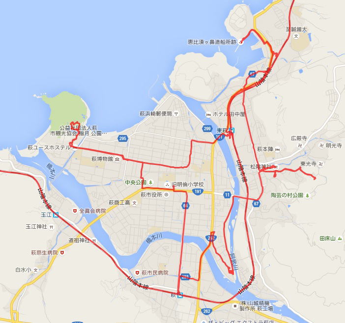 (萩散策。 GPSロガーのログデータで実際に移動した場所の軌跡を表示)