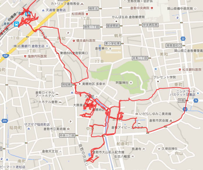 (倉敷散策。 GPSロガーのログデータで実際に移動した場所の軌跡を表示)