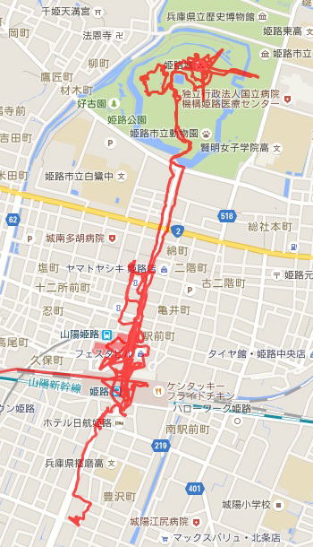 (姫路散策。 GPSロガーのログデータで実際に移動した場所の軌跡を表示)