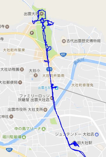 (出雲大社とその周辺の散策。 GPSロガーのログデータで実際に移動した場所の軌跡を表示)