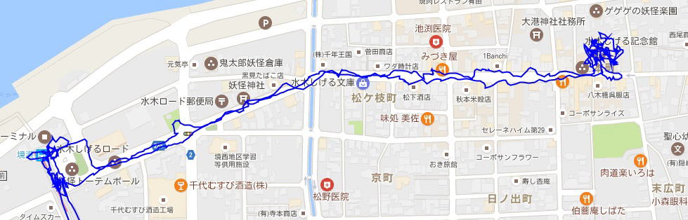 (境港市散策。 GPSロガーのログデータで実際に移動した場所の軌跡を表示)