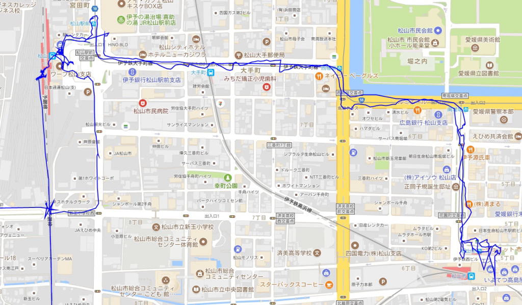 (JR松山駅-伊予電松山市駅間の散策。 GPSロガーのログデータで実際に移動した場所の軌跡を表示)