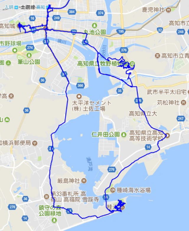 (高知市内の散策。 GPSロガーのログデータで実際に移動した場所の軌跡を表示)