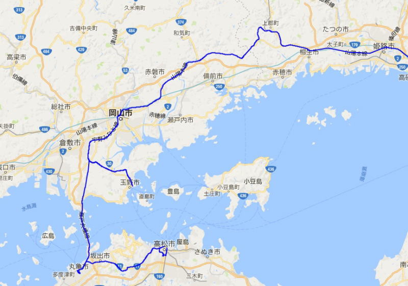 (6日目の行程。 姫路-町田間は省略。 GPSロガーを使って、ログデータから実際に移動した場所を表示。 青色が実際に移動した軌跡。)