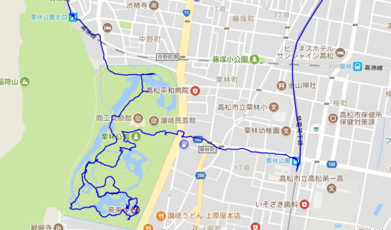 (栗林公園の散策。 GPSロガーのログデータで実際に移動した場所の軌跡を表示)