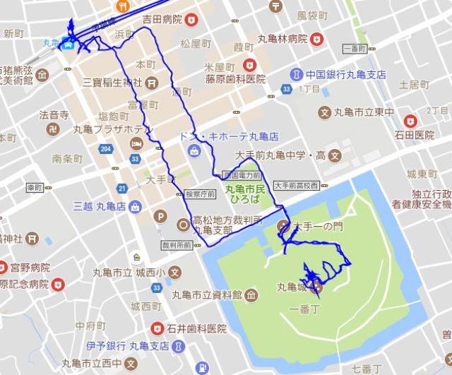 (丸亀市内の散策。 GPSロガーのログデータで実際に移動した場所の軌跡を表示)