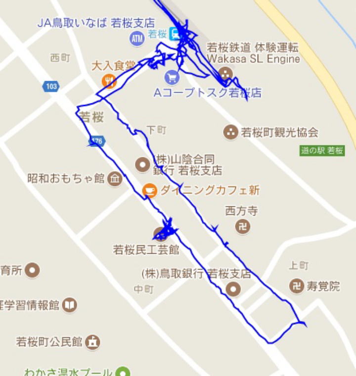(若桜駅周辺の散策。 GPSロガーのログデータで実際に移動した場所の軌跡を表示)