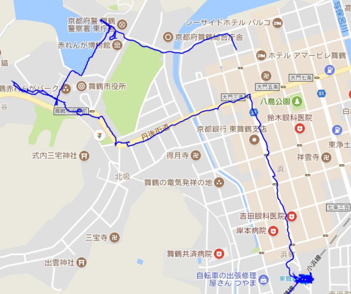 (東舞鶴地区の散策。 GPSロガーのログデータで実際に移動した場所の軌跡を表示)