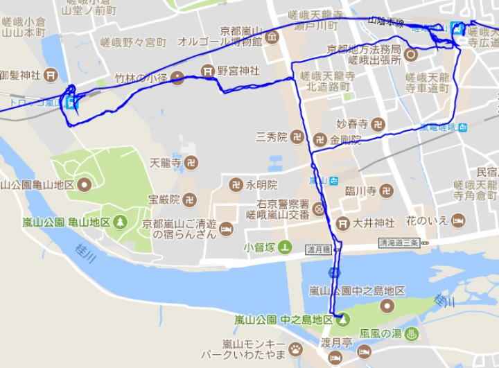 (京都嵐山周辺の散策。 GPSロガーのログデータで実際に移動した場所の軌跡を表示)
