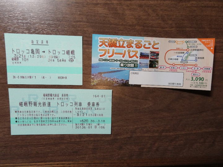 (今回使用した嵯峨野観光鉄道キップと天橋立まるごとフリーパス)