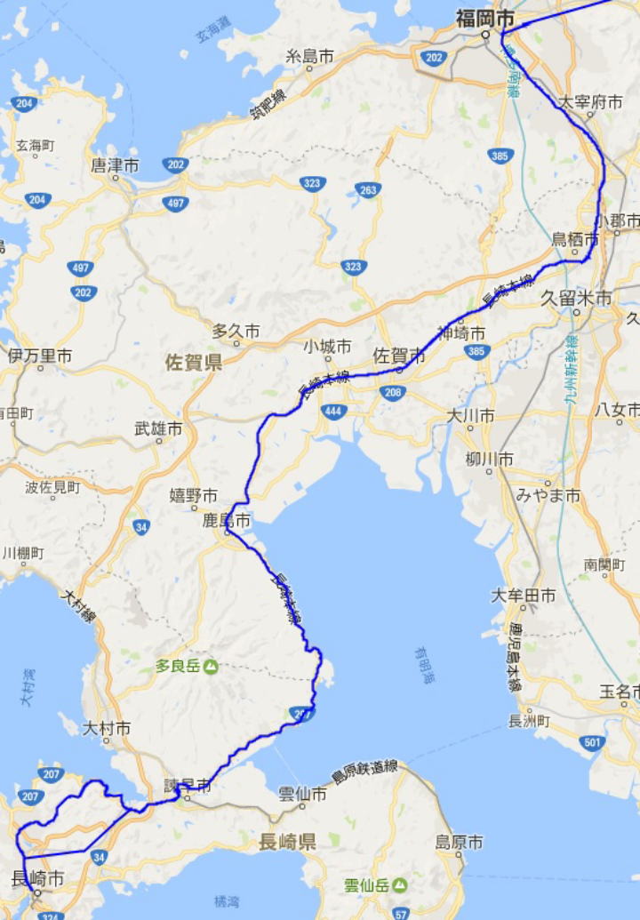 (1日目の行程。 GPSロガーを使って、ログデータから実際に移動した場所を表示。 青色が実際に移動した軌跡。 なお、自宅-福岡空港間は省略)