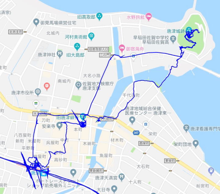 (唐津市内の散策。 GPSロガーのログデータで実際に移動した場所の軌跡を表示)