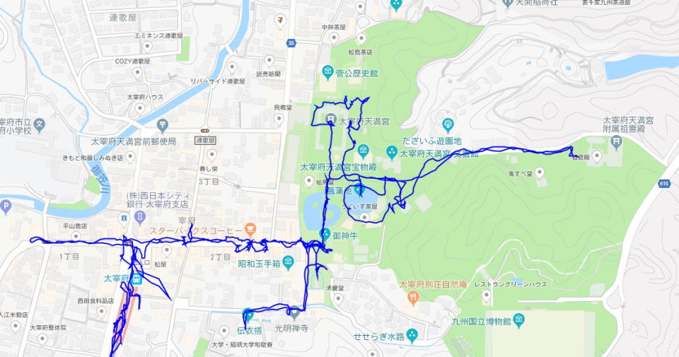 (太宰府天満宮の散策。 GPSロガーのログデータで実際に移動した場所の軌跡を表示)
