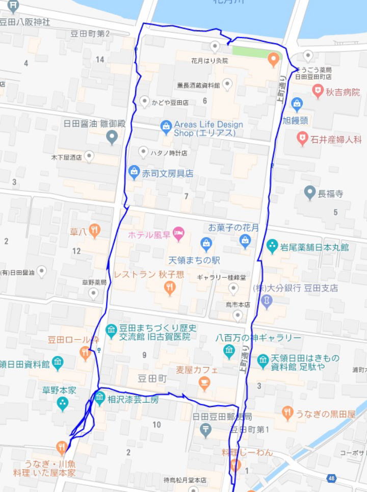 (日田市内の散策。 GPSロガーのログデータで実際に移動した場所の軌跡を表示)