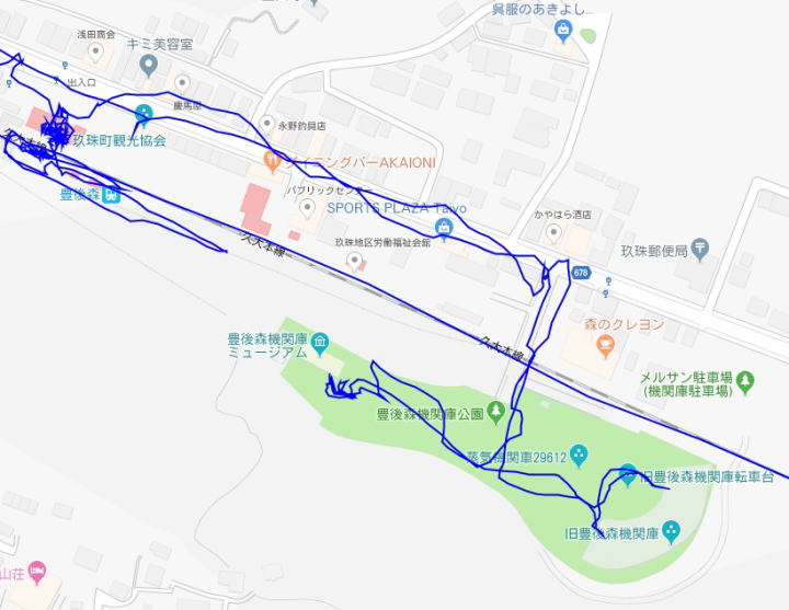 (豊後森駅周辺の散策。 GPSロガーのログデータで実際に移動した場所の軌跡を表示)