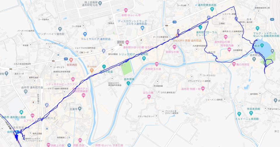 (湯布院温泉街の散策。 GPSロガーのログデータで実際に移動した場所の軌跡を表示)