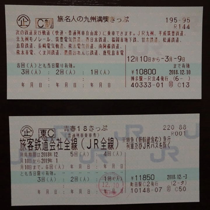 毎年、12月10日から1月10日までは「青春18キップ」の冬季利用可能期間であるが、今回JR九州で通年利用可能な「旅名人の九州満喫きっぷ」と併用