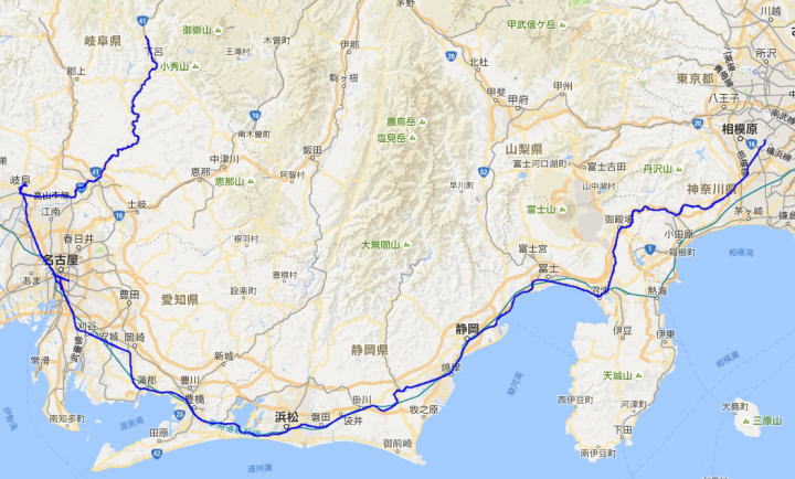 下呂-飛騨萩原(飛騨萩原散策)-美濃太田-岐阜(岐阜散策)-名古屋(名古屋散策)-豊橋-浜松-静岡-沼津-松田‥(徒歩)‥新松田-町田