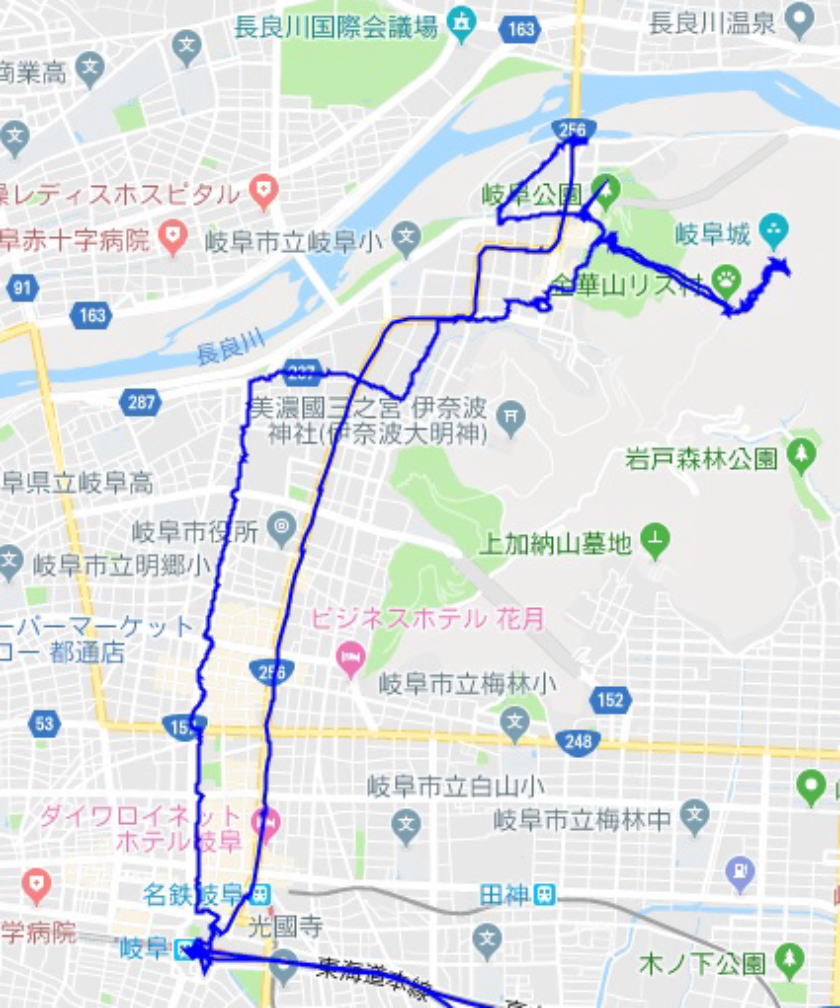(岐阜市内の散策。 GPSロガーのログデータで実際に移動した場所の軌跡を表示)