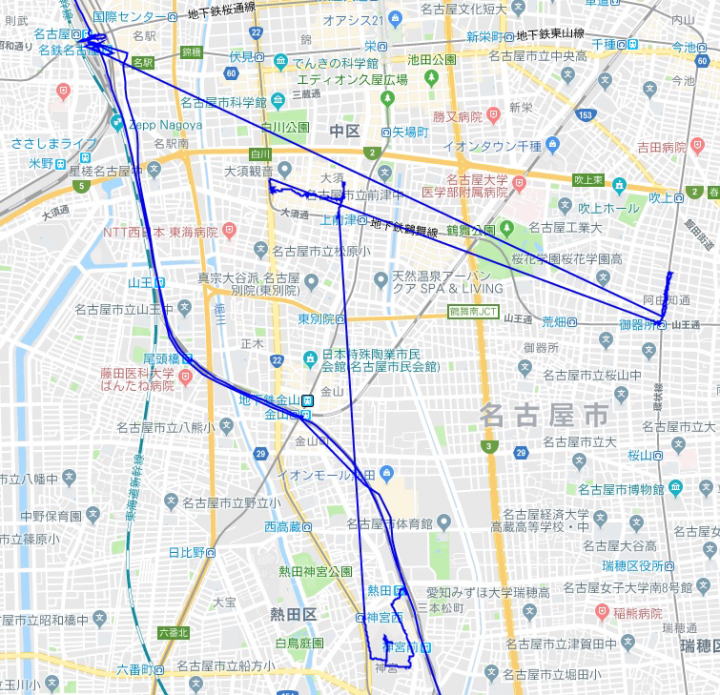 (名古屋市内の散策。 GPSロガーのログデータで実際に移動した場所の軌跡を表示)