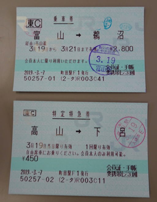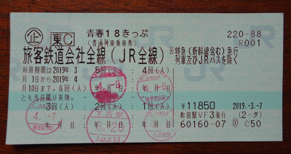 なお、前半の2日目の3月19日(火)は青春18キップは使わず通常のキップ(ただしジパング倶楽部会員なので3割引)を使った。