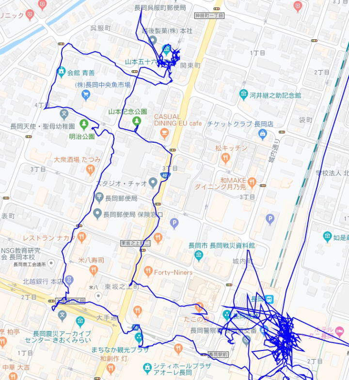 (長岡市内の散策。 GPSロガーのログデータで実際に移動した場所の軌跡を表示)