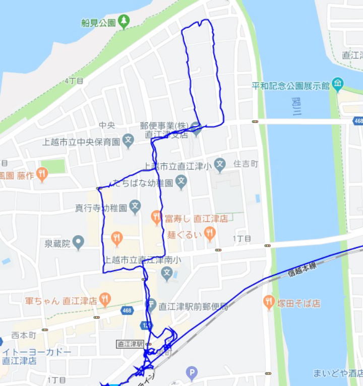 (直江津駅周辺の散策。 GPSロガーのログデータで実際に移動した場所の軌跡を表示)