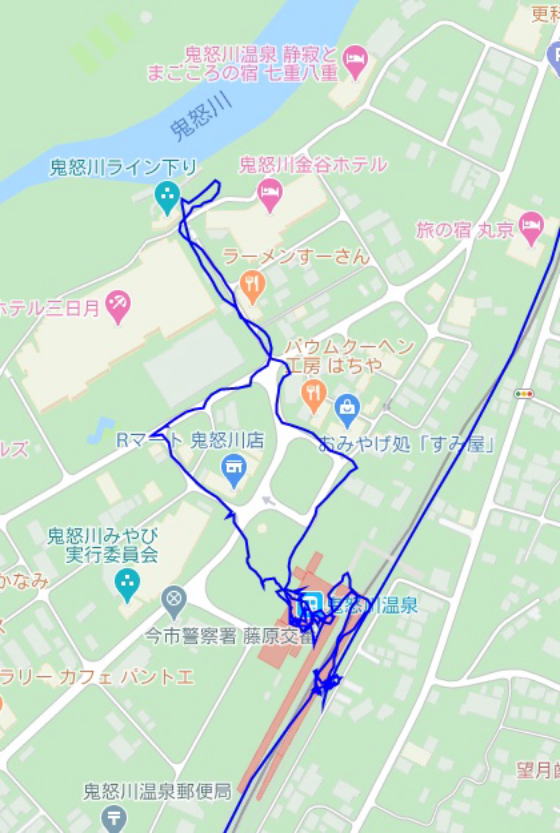 (鬼怒川温泉駅周辺の散策。 GPSロガーのログデータで実際に移動した場所の軌跡を表示)