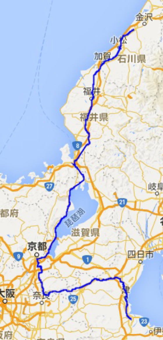 移動ルートは、金沢-敦賀が北陸本線、敦賀-京都が湖西線、京都-木津が奈良線、木津-亀山が関西本線、亀山-松阪が紀勢本線、というルートである。