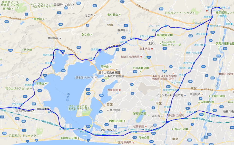 (遠州鉄道と天竜浜名湖鉄道西ルート。 GPSロガーのログデータで実際に移動した場所の軌跡を表示)